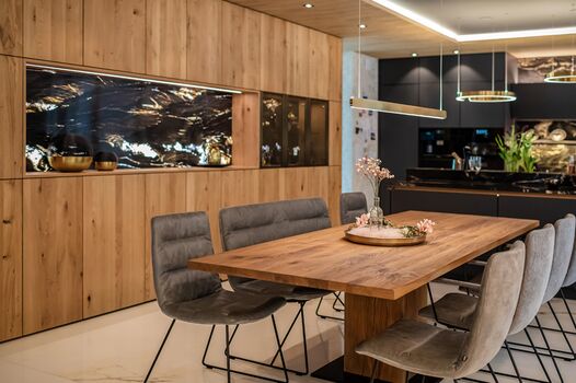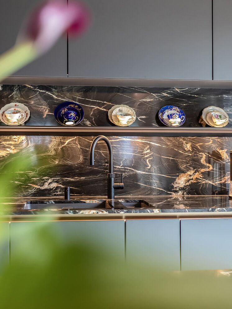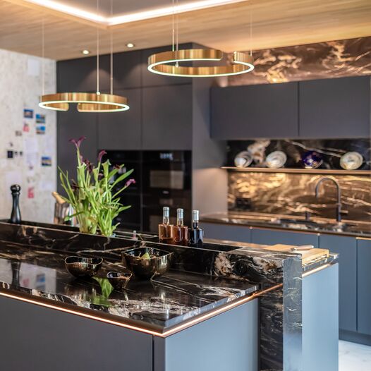 Ein Raum wie eine Bühne: Dunkler Granit, durchzogen von feinen weiß-goldenen Adern, verleiht dieser Küche einen Auftritt mit Charakter. Inspiriert von Reisen in den arabischen Raum treffen hier edle Materialien auf präzise Planung. Goldene Lichtakzente und großzügige Flächen schaffen eine Atmosphäre, die zugleich repräsentativ und wohnlich wirkt.