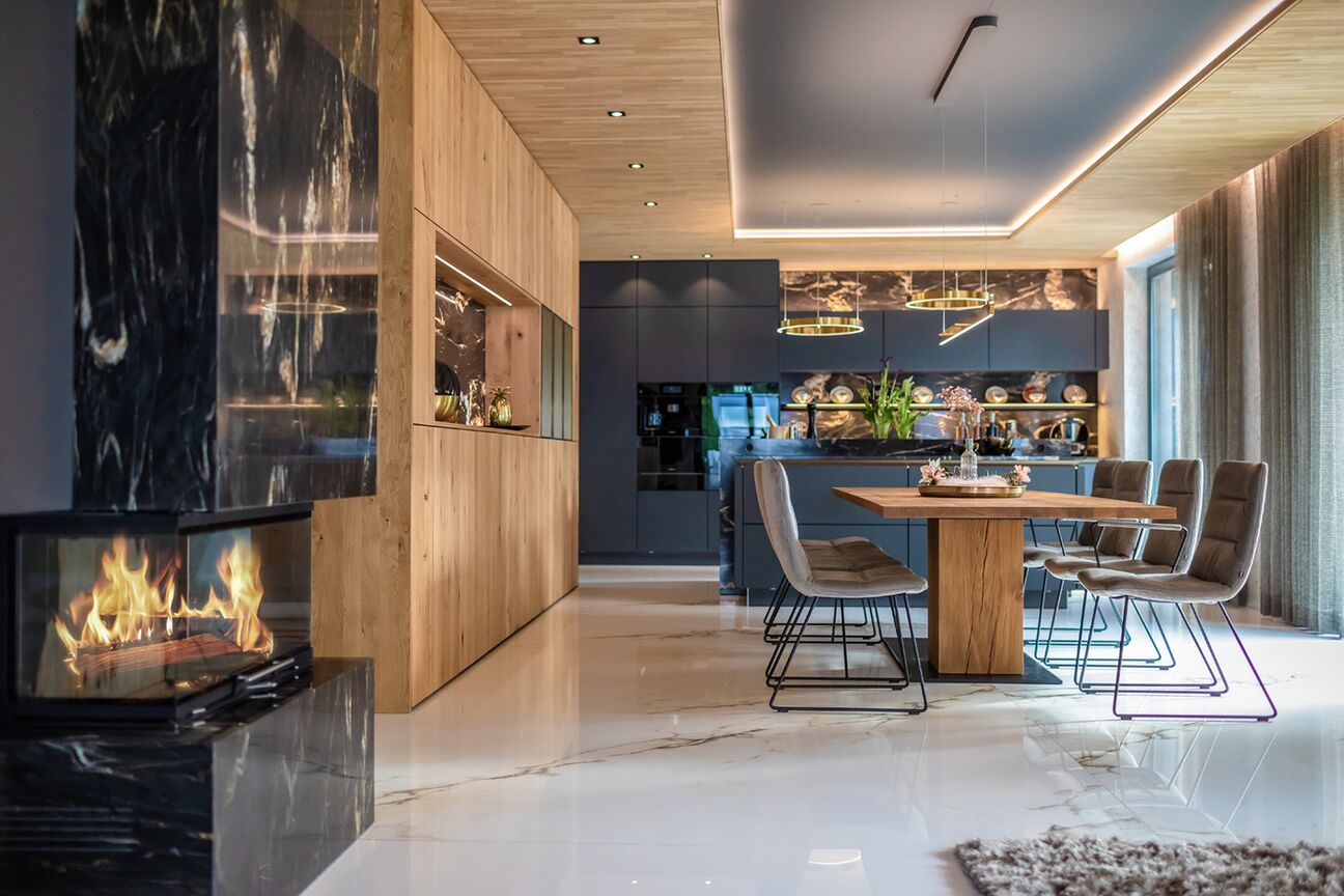 Besonderes Highlight ist die große Präsentationsnische mit einer durchgehenden, hinterleuchteten Naturstein-Rückwand. Hier zeigt der Granit seine volle Wirkung: Die LED-Flächenbeleuchtung hebt die Aderung hervor und bringt Tiefe ins Material. Auch an Bar-Elementen und beim Kamin wird der Stein gezielt mit Licht kombiniert – ein Spiel aus Kontrast und Eleganz, das den Raum prägt.