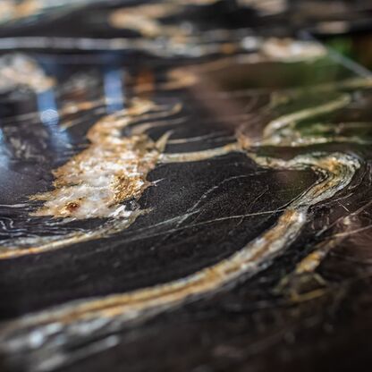 Belvedere ist ein tiefschwarzer Granit mit markanter weiß-goldener Aderung. Je nach Quelle wird er petrographisch auch als Quarzit oder Gneis klassifiziert und in Namibia/Angola abgebaut. Dank seiner Robustheit eignet er sich ideal für Arbeitsplatten, Rückwände und Verkleidungen; gängige Finishes sind poliert oder leathered.