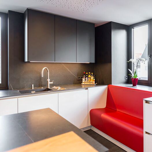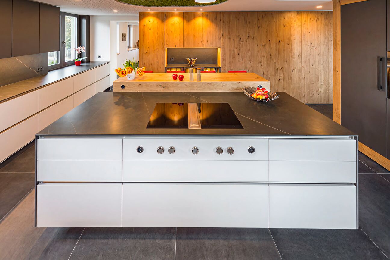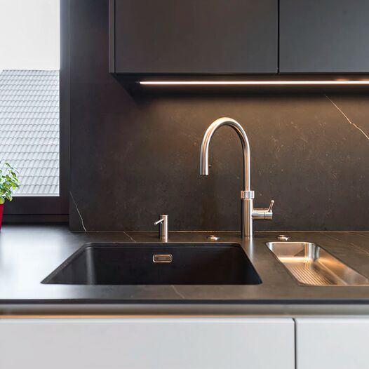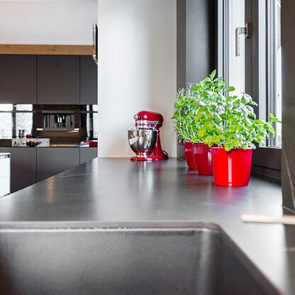 Die Arbeitsplatten und Seitenwände wurden aus Neolith Calatorao gefertigt – ein grauen Kalkstein aus Aragón, der seit über 2.000 Jahren abgebaut wird. Charakteristisch sind die intensive, graue Farbgebung und die feinen, goldfarbenen Maserungen. Das Material ist widerstandsfähig, pflegeleicht und in präzisen Zuschnitten verarbeitet – perfekt für großformatige Flächen mit moderner Anmutung.