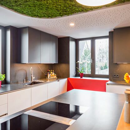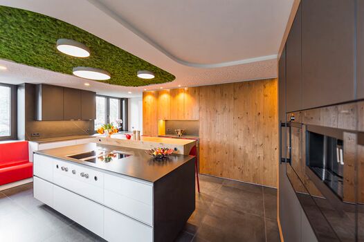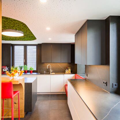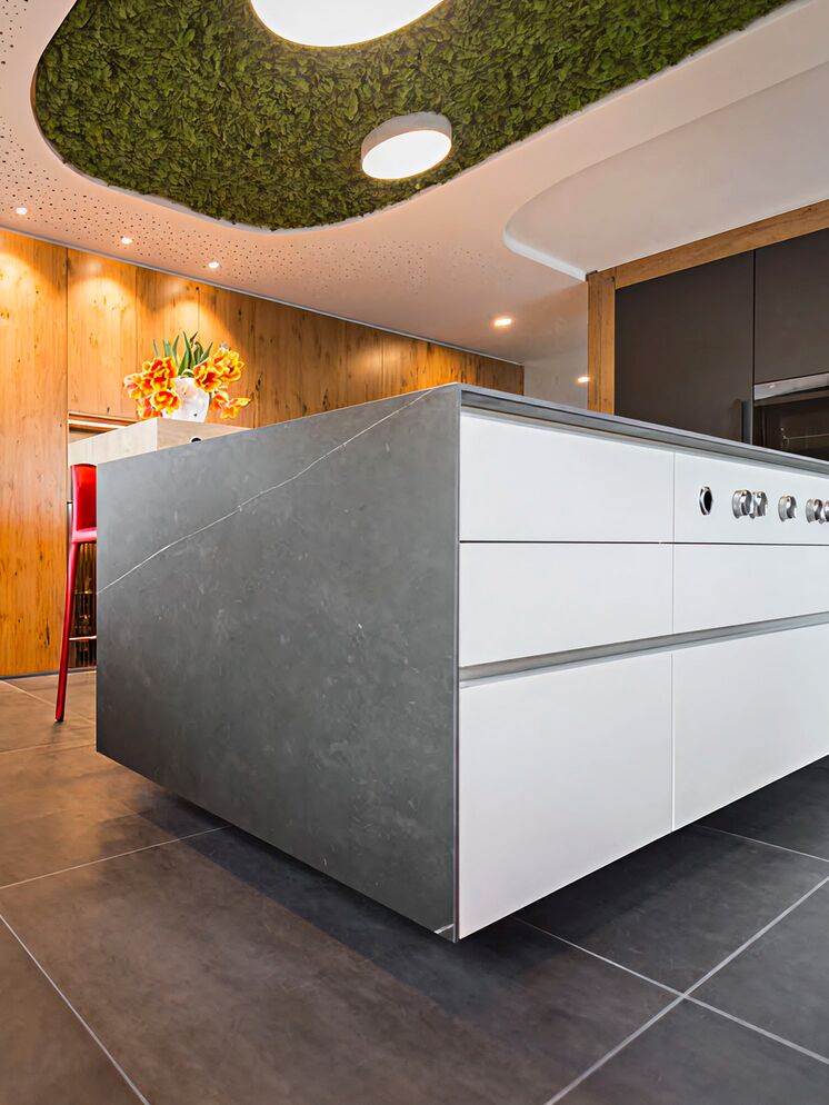 Die schwebende Kochinsel bildet das Herzstück; eine maßgefertigte Bar lässt den Block leicht erscheinen und schafft Platz für Gäste. Akzentuiertes Licht und Details wie die begrünte Moosdecke unterstützen die ruhige Materialwirkung, ohne sie zu überstrahlen.