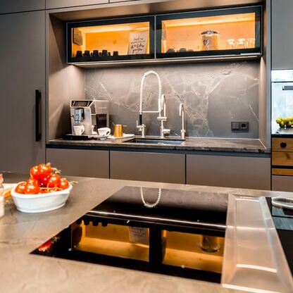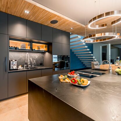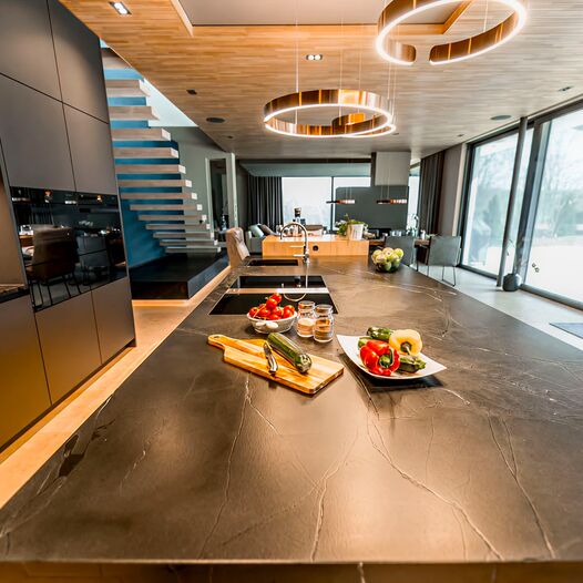Ein Zentrum zum Ankommen: Dunkler Negresco-Naturstein trägt diese Küche – ruhig, kraftvoll, mit feiner weißer Zeichnung. Die große Insel wirkt schwebend, der Stein umhüllt sie wie ein Rahmen: klare Kanten, viel Fläche, Licht als leise Inszenierung. So entsteht ein Raum, der Alltag und Atmosphäre selbstverständlich verbindet.