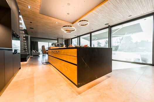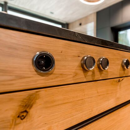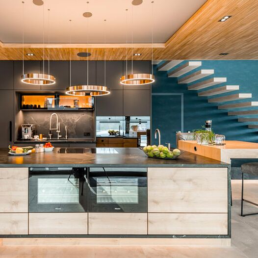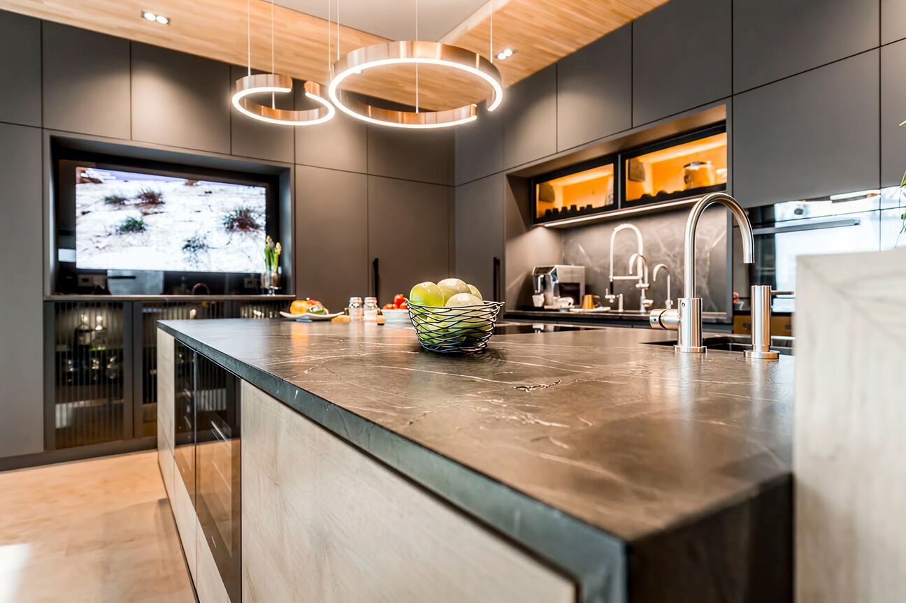 Eingesetzt wurden Negresco-Natursteinplatten – dunkel, charaktervoll und ideal, um großzügige Flächen mit ruhiger Zeichnung zu realisieren. Der Stein rahmt die Insel umlaufend und setzt Akzente auf Arbeitsflächen; seine Tiefe bringt den gewünschten Kontrast zum warmen Holz. So entsteht ein ausbalanciertes Zusammenspiel aus Materialruhe und Präsenz.