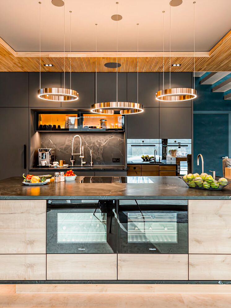 - Gesamtkonzept: Küche als wohnlicher Mittelpunkt mit ruhiger Lichtführung und warmen Holzakzenten