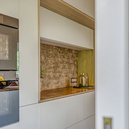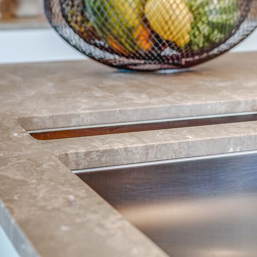 Im Mittelpunkt steht ein Dolomitstein in 20 mm, gebürstet und geschliffen – mit sanfter, mineralischer Zeichnung und angenehmer Haptik. Der Stein wurde für die Arbeitsplatten und die Rückwand verwendet, wodurch sich eine bewusste Harmonie mit den lotosweißen Fronten ergibt. Die ruhige Textur sorgt für Wärme und Verbindlichkeit. Das natürlich Material gibt dem Raum Charakter, ohne laut zu werden.
