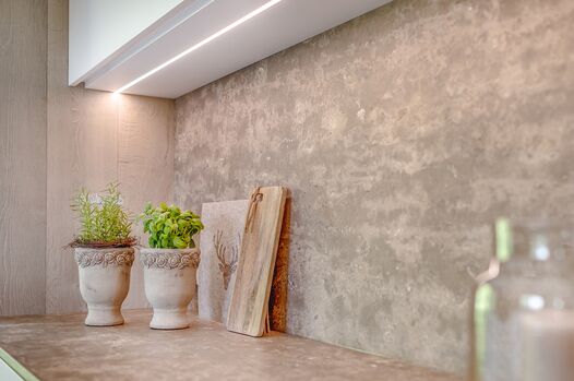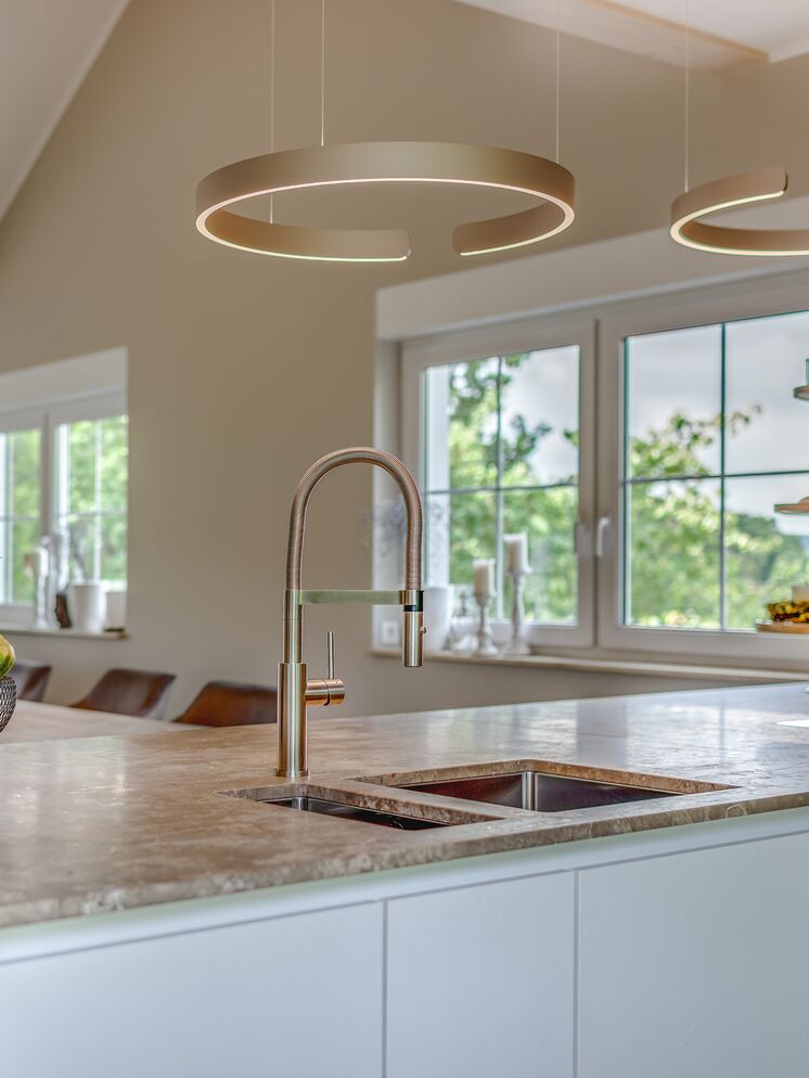 Die Lichtführung macht die Oberfläche des Dolomitsteins sichtbar, statt sie zu überstrahlen. Dafür sorgt die dezente LED-Linie oberhalb der Arbeitsplatte, mit ringförmigen Leuchten als ruhigem Gegenpart. Das Resultat ist ein weiches, stimmiges Ambiente