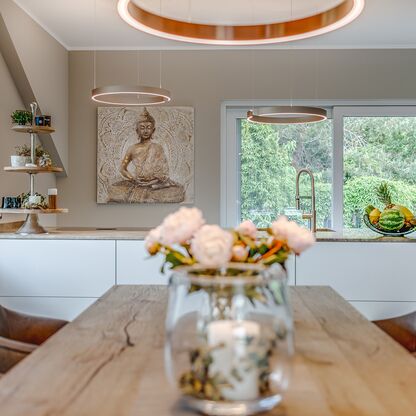 Helles Lotosweiß trifft auf warmen, erdigen Naturstein. Diese Küche erzählt von Ruhe, Klarheit und Ritual – inspiriert von buddhistischen Motiven wie Lotosblüte und Achtsamkeit. Das Licht führt die Textur des Steins, die Formen bleiben gelassen und präsent. So entsteht ein Ensemble, das den Alltag entschleunigt und zugleich starke, zeitlose Akzente setzt.