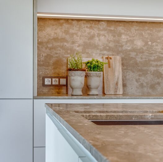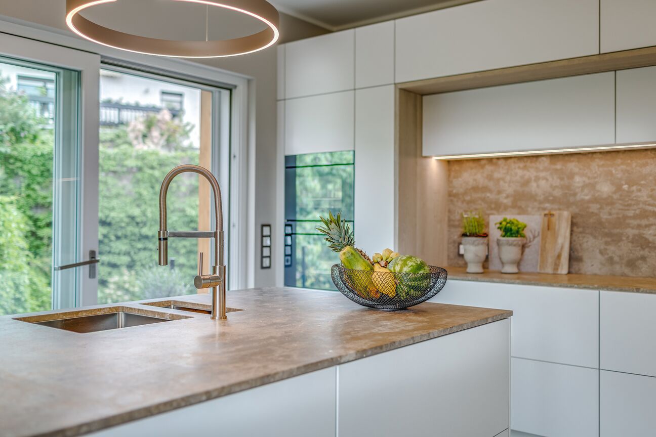 - Einsatz: Arbeitsplatten und Rückwand in Naturstein, abgestimmt auf lotosweiße Fronten.
